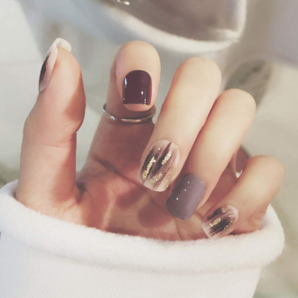 Amazon Com Poliphili 24pcs Colorful Gold Foil False Nail Tips Short Square Full Coverage Acrylic False Nail Glitter Design Different Decoration Grey Maroon Foil Beauty