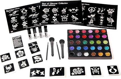 Amazon Com Custom Body Art Glitter Tattoo Kit With 12 Large Glitter Colors 30 Uniquely Themed Temporary Tattoo Stencils 2 Glue Applicator Bottles 2 Glitter Brushes For Children Teenagers Adults Beauty