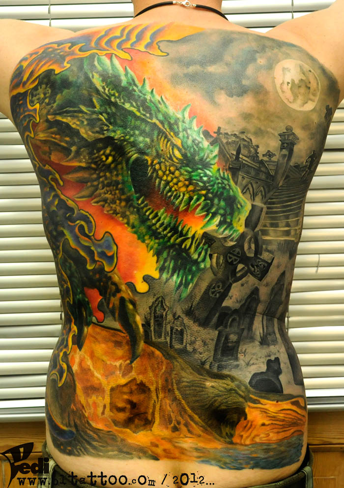 3d Like Very Detailed Colored Massive Godzilla With Dragons Tattoo On Whole Back Tattooimages Biz
